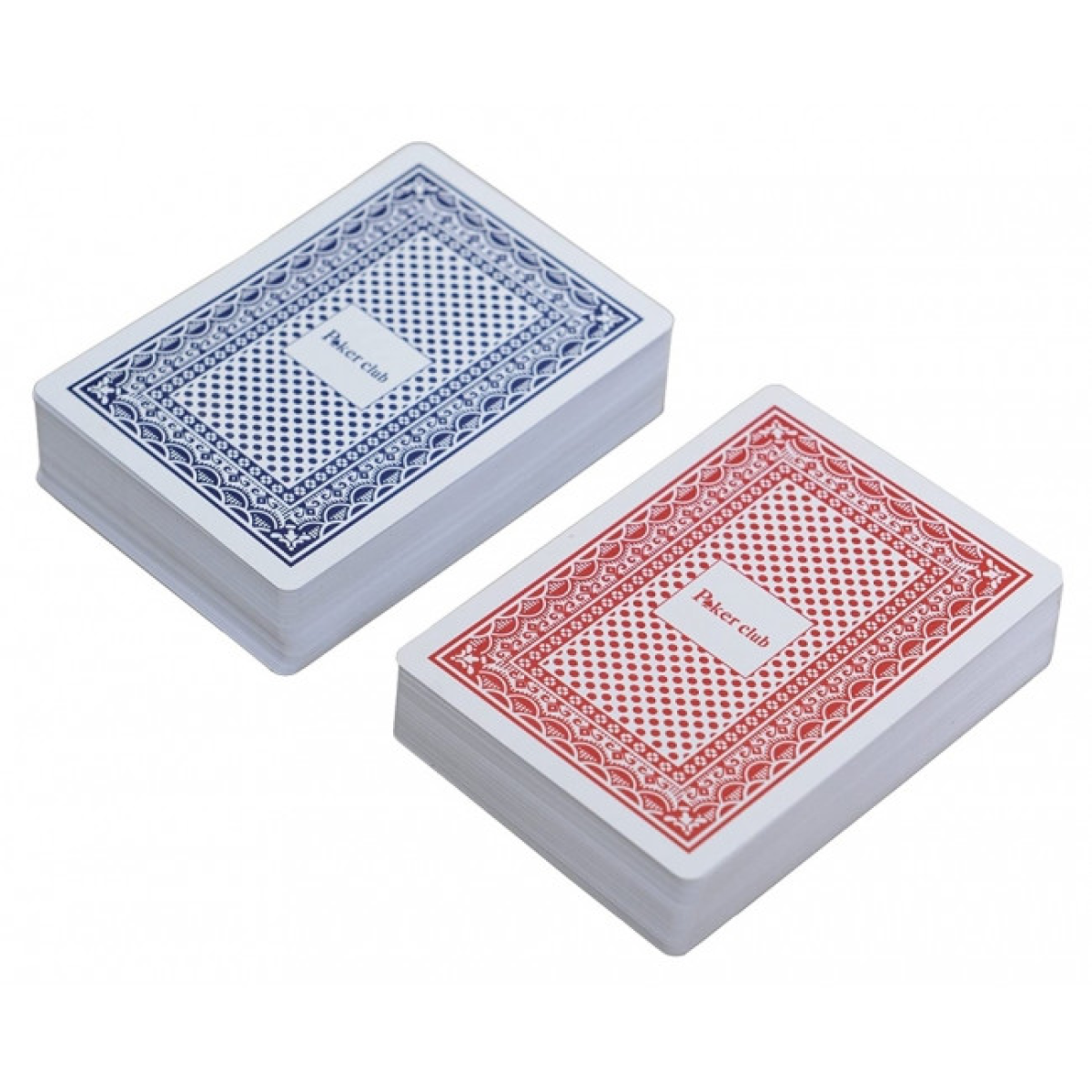 Пластикові карти Poker Club - 100% пластикові гральні карти покерного розміру зі збільшеним індексом. Карти добротні, приємно лежать у руці. Обличчя карт - гладке, на сорочці на дотик відчувається легке тиснення. Пластикові карти виконані в класичному дизайні, мають відмінні ігрові характеристики. Колір сорочки - синій та червоний.