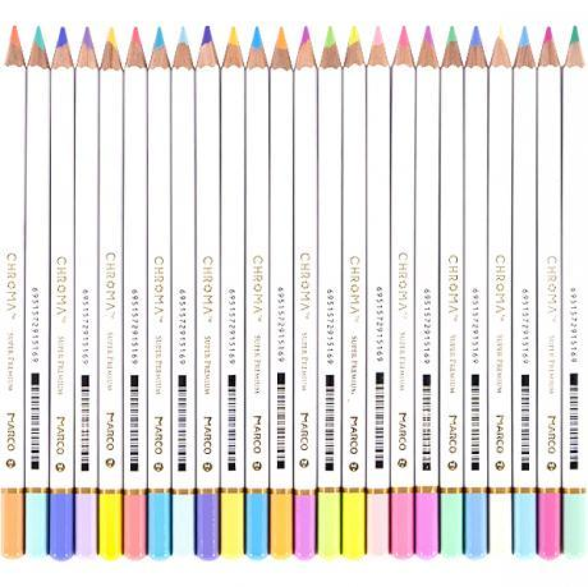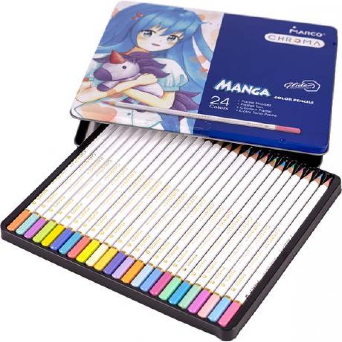 Набір з 24 кольорових олівців Marco 8550-24TN преміальної серії “Chroma“ (Manga, Манга) у металевому пеналі, м“який грифель, попередньо заточений, без гумки. Корпус олівця покритий якісним лаком білого кольору. Шестигранна форма, товщина грифелю 3,3 мм. Значно збільшено ковзання грифеля, тим самим покращено легкість нанесення малюнка. Для полегшення знаходження олівця потрібного кольору частина корпусу пофарбована у відповідний відтінок із зазначенням цифрового коду з панелі Marco.