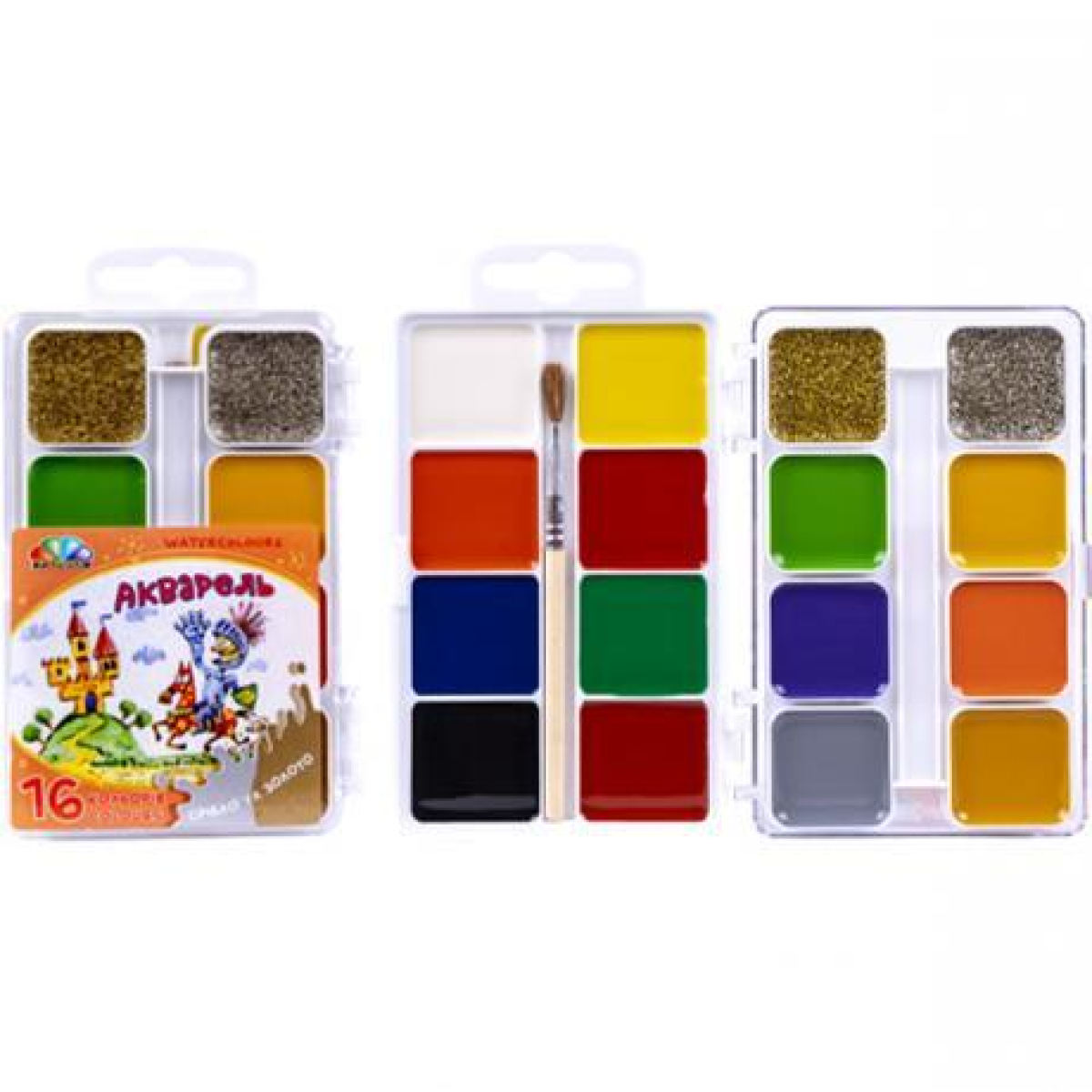 Дитяча акварель 16 кольорів “Казковий світ“ з пензлем, пластик “Гамма“ 11,5*7,5см KNZ