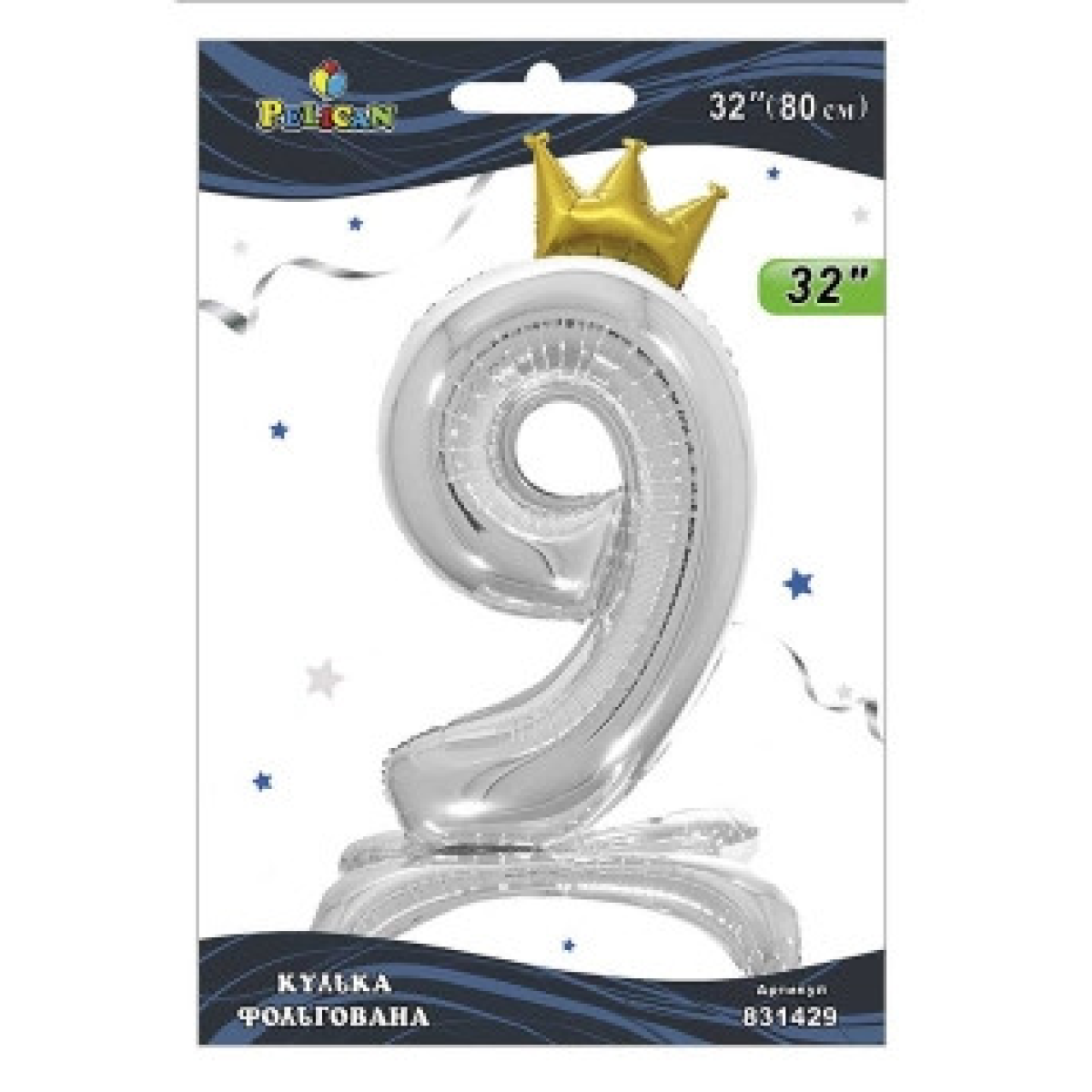 Кулька фольгована цифра з короною на підставці “9“ срібло 32“ (80см) Pelican Срібний Pelican (831429) KNZ
