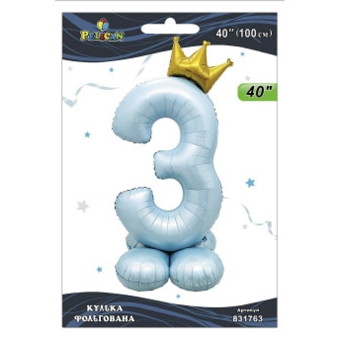 Кулька фольгована цифра з короною на підставці “3“ блакитна 40“ (100см) Pelican Блакитний Pelican (831763) KNZ