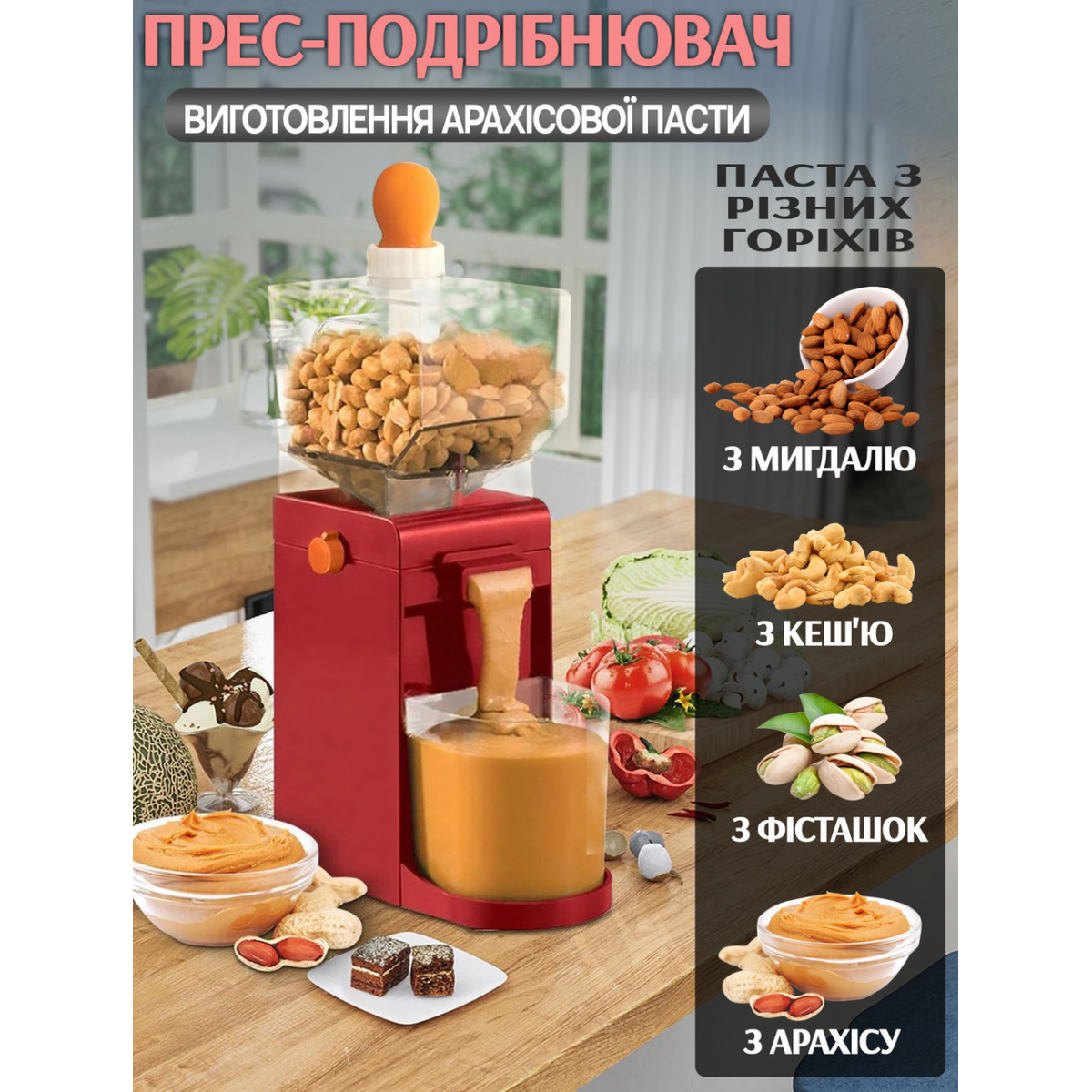 Апарат прекрасно працює з різними горіхами, такими як арахіс, кешью, мигдаль, фундук, горіх макадамія, насіння соняшнику і багато іншого. Працює від мережі 220В.