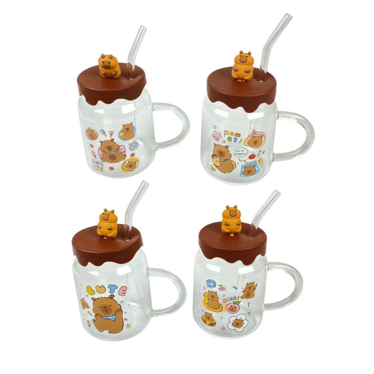 Чашка скляна 500 мл “Капібара“ із силіконовою кришкою, трубочкою, 4 різновиди (9497) KNZ
