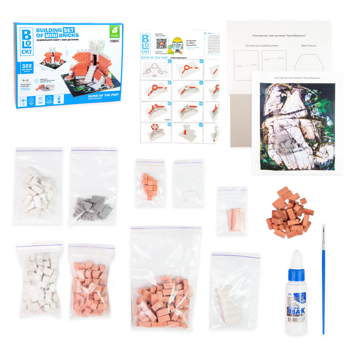 ♦ Комплектація: коробка, цеглинки - 322 ел., клей ПВА, пензлик - 1 шт., інструкція.