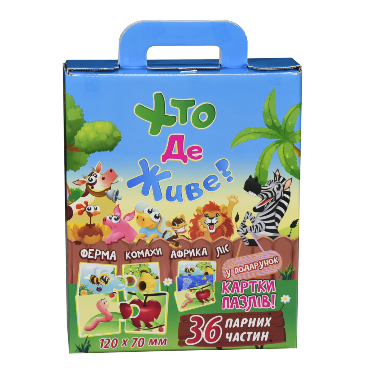 Загалом у наборі 36 міні-пазлів, що складаються з двох частин – необхідно підібрати кожній тварині її оселю. Щоб допомогти малюку в комплекті, є картки з готовими картинками.