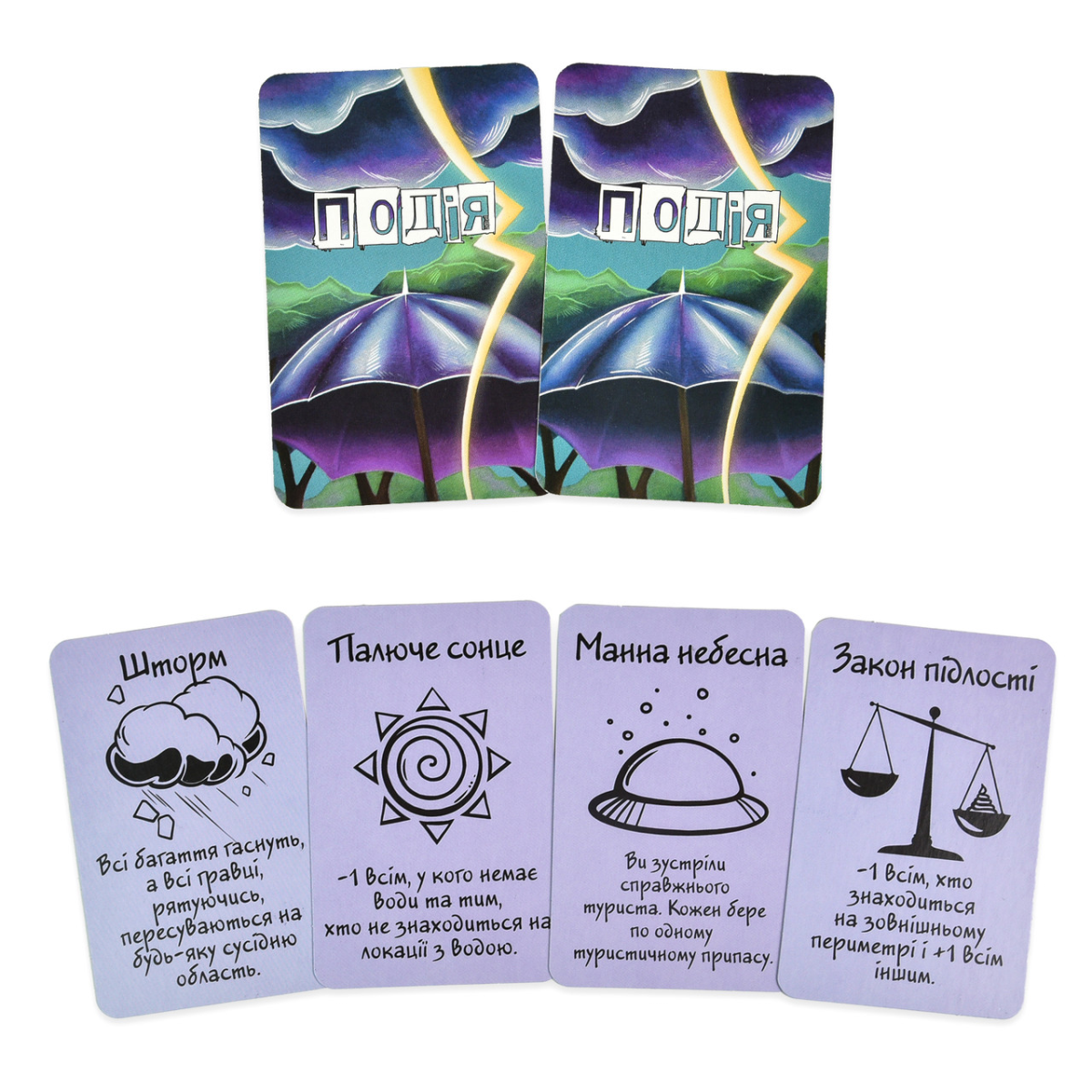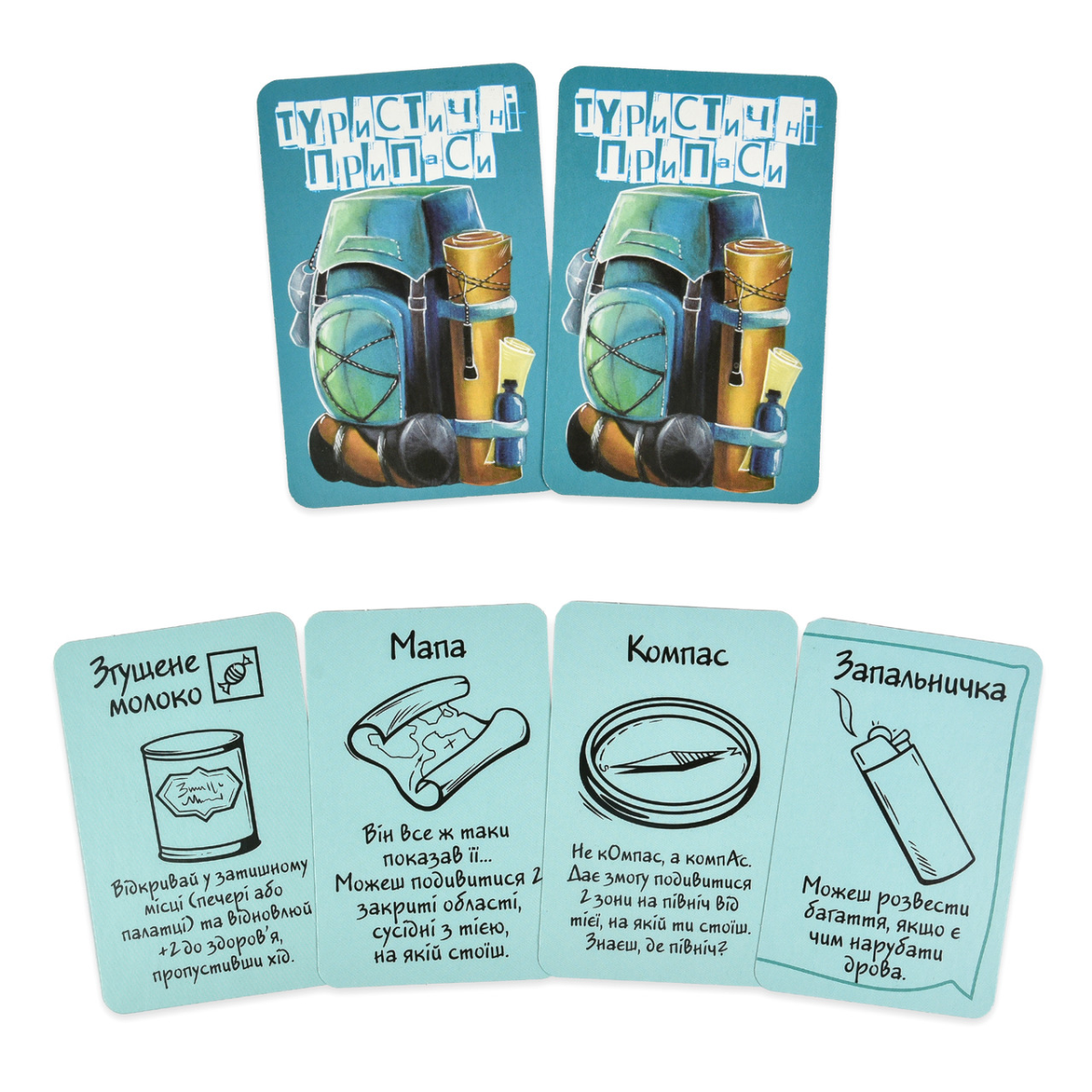 ♦ Комплектація: коробка, гральні картки - 99 шт., поля - 25 шт., планшетки персонажів - 4 шт., фішки - 8 шт., жетони - 40 шт., фігурка вогнища - 8 шт., фігурка води -14 шт., дрова - 8 шт., пісковий годинник - 1 шт., інструкція.