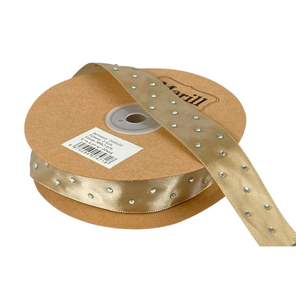 Атласна стрічка 2,5 см х 18 м зі стразами бежева (D19125-A2-076)