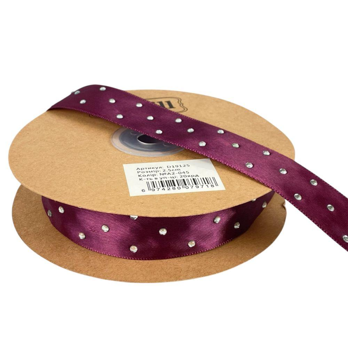 Атласна стрічка 2,5 см х 18 м зі стразами вишнева (D19125-A2-045)