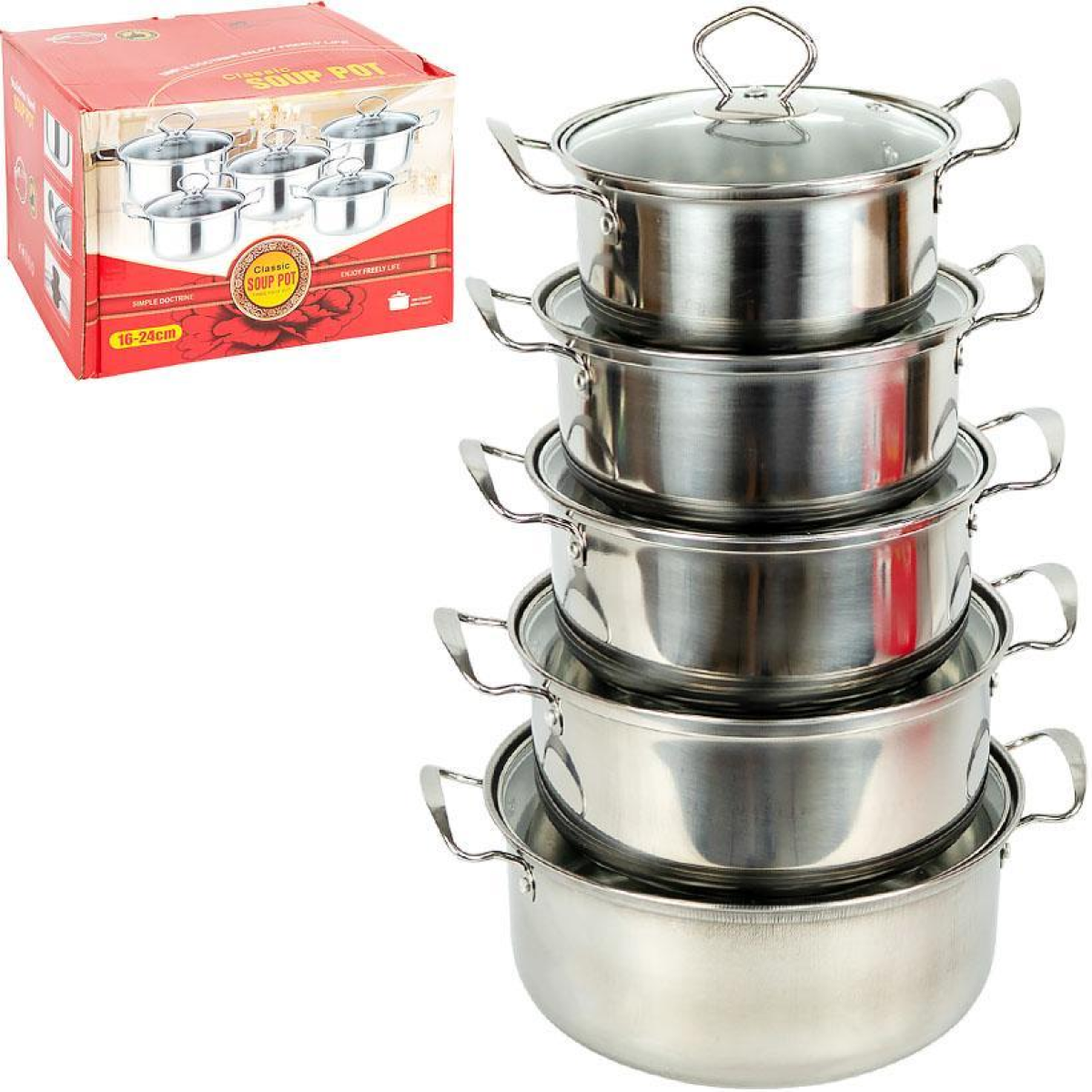 Набір каструль Classic Soup Pot, 10 предметів (1 л, 1,5 л, 2 л, 2,5 л, 3 л) – практичний та зручний комплект для щоденного використання на кухні. Каструлі виготовлені з міцної нержавіючої сталі, що відрізняється довговічністю, стійкістю до корозії та легкістю у догляді. У набір входять каструлі різних об'ємів, що дозволяє готувати як невеликі страви, так і їжу для сім'ї. Кожна каструля комплектується кришкою, при цьому ручки до кришок йдуть окремо і самостійно прикручуються. Це робить упаковку більш компактною та зручною для зберігання або транспортування.