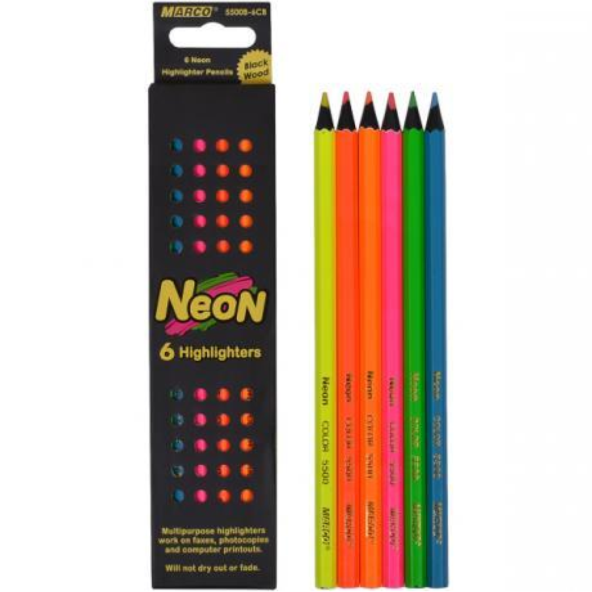 Серія олівців-маркерів Neon від компанії Marco стане ідеальним засобом для виділення необхідної інформації як при конспектуванні під час навчання, так і в розстановці необхідних акцентів в офісному діловодстві. Грифель олівців з ефектом відсутності висихання, виготовлений за особливою формулою, завдяки якій ви отримаєте соковиті та яскраві кольори, необхідні для роботи. Представлені тут заточені неонові олівці 5500-6СВ серії Neon від Marco, з діапазоном палітри 6 кольорів, мають шестигранний профіль з лаковим покриттям, виготовлені з натуральної високоякісної деревини, і мають стійкий до ударів і кришення грифель товщиною 2.9 мм. Олівці яскравих неонових кольорів серії Neon дозволяють розширити колірну гаму, а також можуть використовуватися як текстовиділювач. Набір з 6 кольорів.