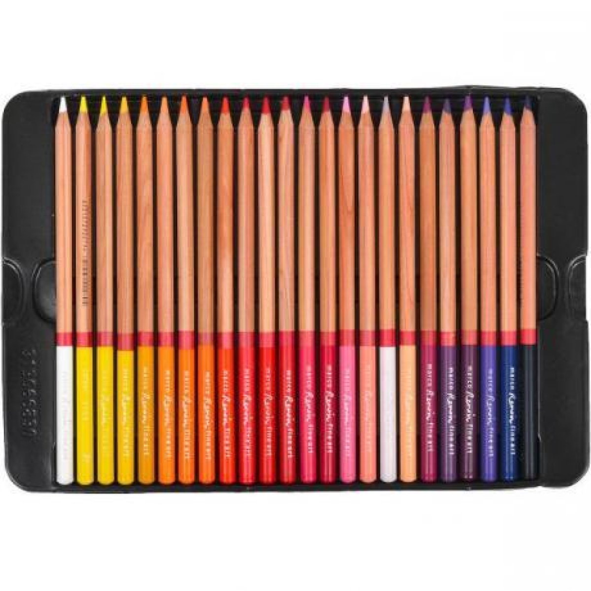Набір кольорових художніх олівців “Renoir Fine Art“ у металевій коробці. Тіло олівця виготовлене з високоякісної деревини канадського кедра і частково забарвлене в колір грифеля, що надає олівцю стильної елегантності. Грифель товщиною 3. 7 мм виготовлений за спеціальною технологією з використанням високоякісних екологічних компонентів і відповідає всім вимогам, які пред“являють до олівця професіонали. Олівці розкладені на трьох платформах.