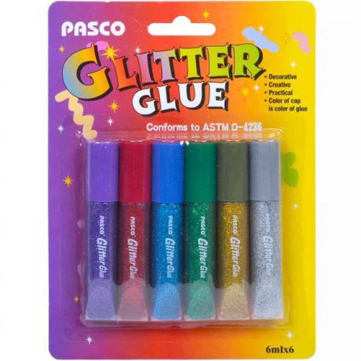 Клей силіконовий з блискітками на картоні “Pasco“ (6 кольорів, 6 мг) KNZ