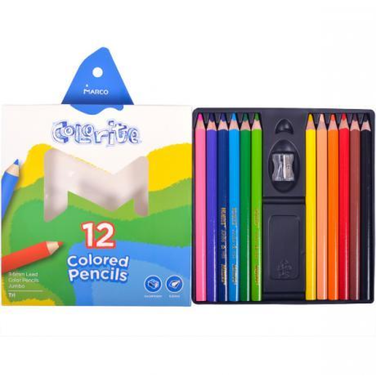Серія Colorite Jumbo від компанії Marco розроблена спеціально для дітей, з основним упором на більший розмір корпусу олівців та їх грифелів. Олівці серії з яскравими та насиченими кольорами не потребують сильного тиску на корпус для отримання яскравої лінії малюнка, що дозволяє без особливого навантаження отримати яскраву картинку навіть найменшому художнику. Форма олівців спеціально розроблена таким чином, щоб надавати оптимальний рівень стиснення для маленької руки в ті моменти, коли дитина пише або малює. Заточені олівці з тригранним профілем та лаковим покриттям, виготовлені з натуральної високоякісної деревини, і мають стійкий до ударів та кришення товстий грифель завтовшки 5 мм. Набір з 12 кольорів та точилка у пластиковому корпусі.