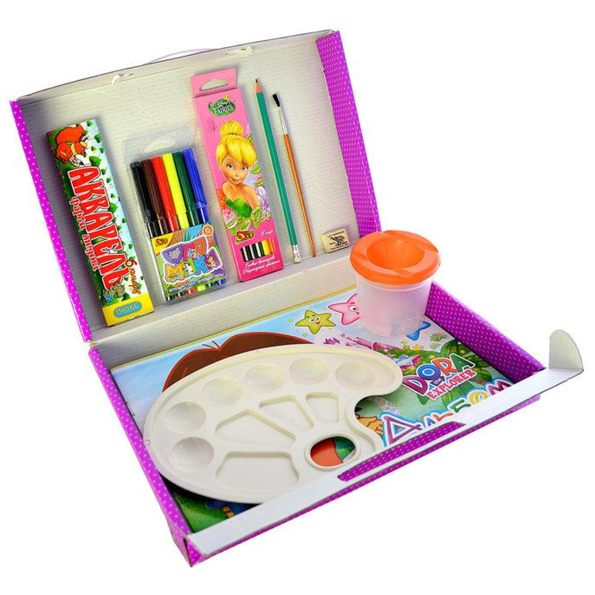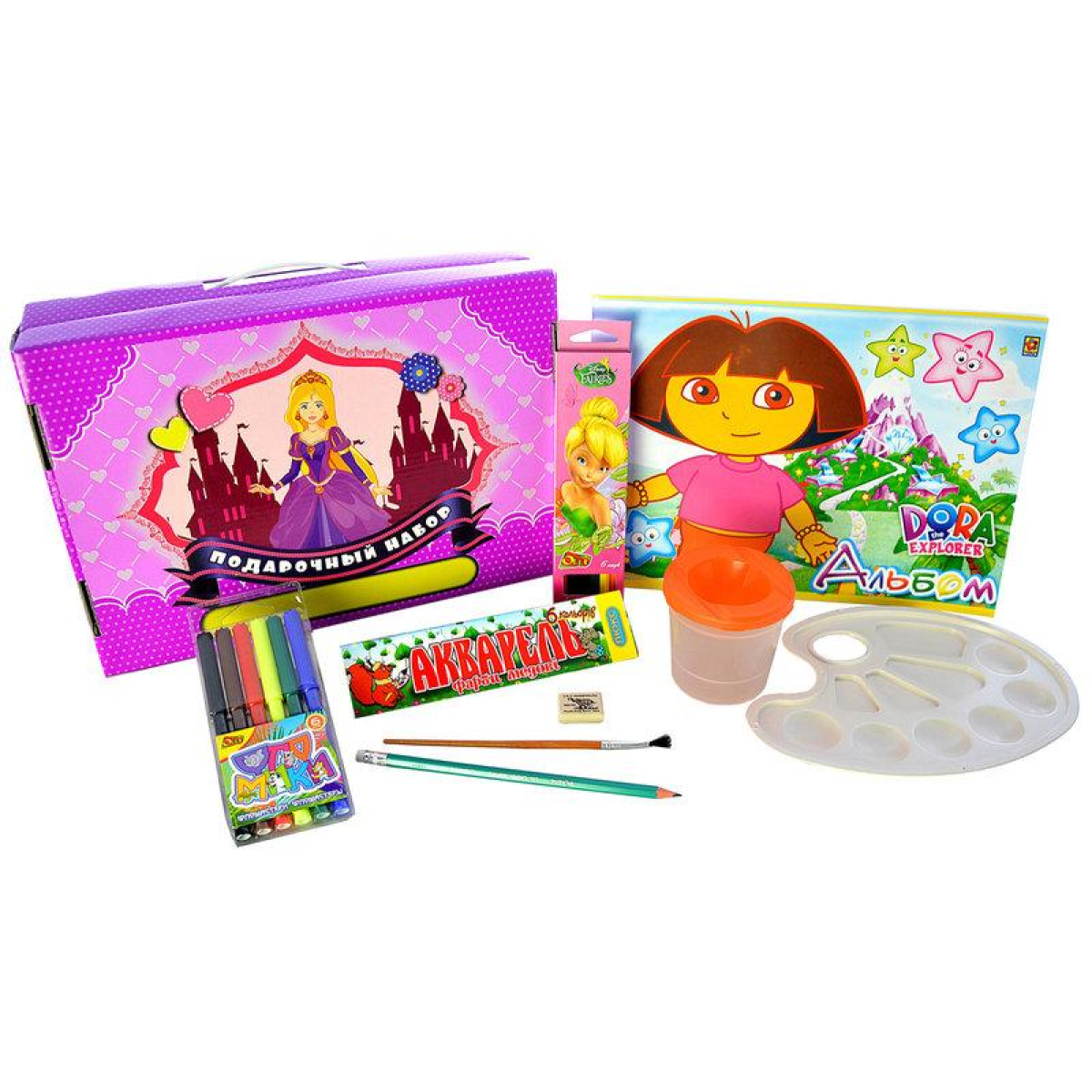 Подарунковий набір для творчості “Принцеси“ - це набір якісних канцелярських приналежностей для юного художника або майбутнього першокласника. Набір упакований в яскраву і зручну подарункову коробку-чемоданчик і складається з 10 предметів.