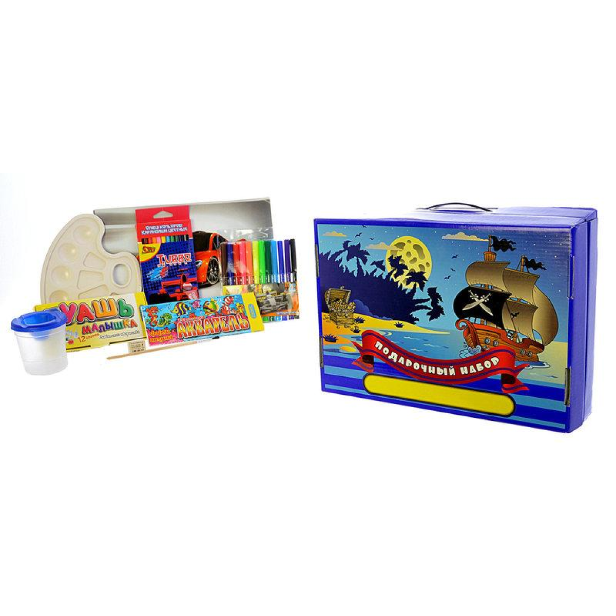 Подарунковий набір для творчості “Пірат“ - це набір якісних канцелярських приналежностей для юного художника або майбутнього першокласника. Набір упакований в яскраву і зручну подарункову коробку-чемоданчик і складається з 11 предметів.